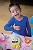 Garçon rigolant avec le bout du nez bleu, devant un visage en pâte d'amandes