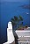 Vue de la mer Egée depuis une terrasse d'une maison de Santorin