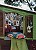 Des cartes postales anciennes ont été customisées avec des paillettes, des boutons nacrés et des fleurs au crochet puis alignées et collées sur un tissu bleu fixé sur le fenêtre d'une roulotte