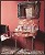 Salle de bain : face à la baignoire, un petit meuble-vasque en marbre rouge sur pied en métal très travaillé. Au-dessus, un miroir vénitien. Un fauteuil ancien Thonet apporte ses courbes à cet étonnant décor.