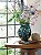 Tiges fleuries en pâte fimo entourant un vase chiné en brocante