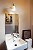 La maison d'un collectionneur en région parisienne: dans la salle de bains en grès gris, des champignons sur l’armoire à pharmacie