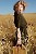 Femme dans un champ; elle tient un cartable et porte un gilet en laine et des gants en cachemire
