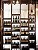 Etagères destinées à entreposer des bouteilles de vins, faites avec de la tuyauterie. Derrière un rideau écru suspendu au plafond.